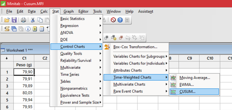 Ingresar a Minitab y cargar 20 datos y luego seleccionar la carta CUSUM