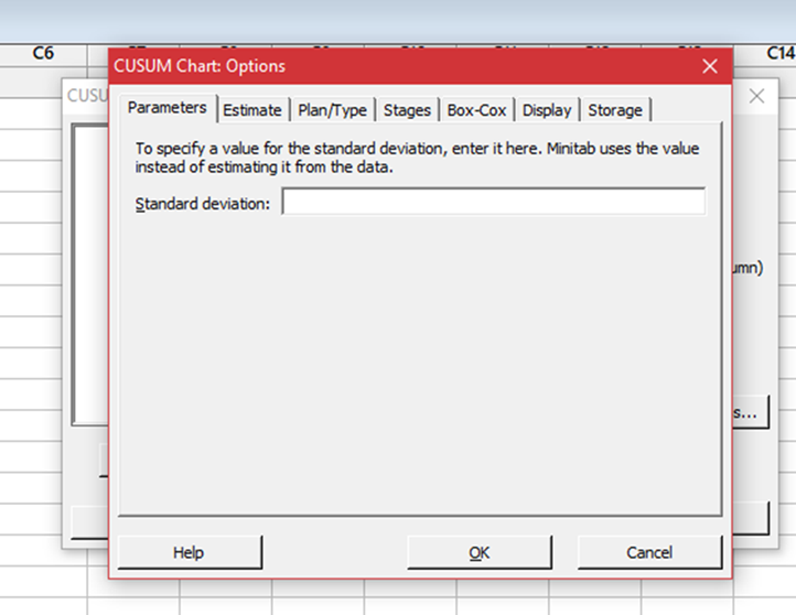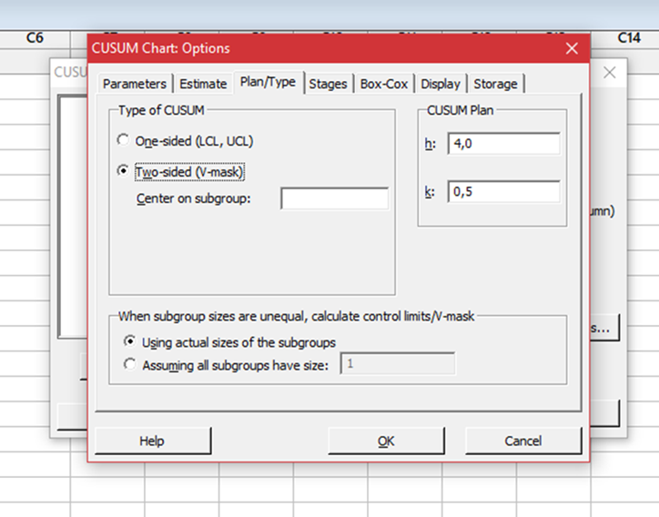 Seleccionar solapa Plan/Tipo y elegir tipo de CUSUM de 2 lados (V-mascara)