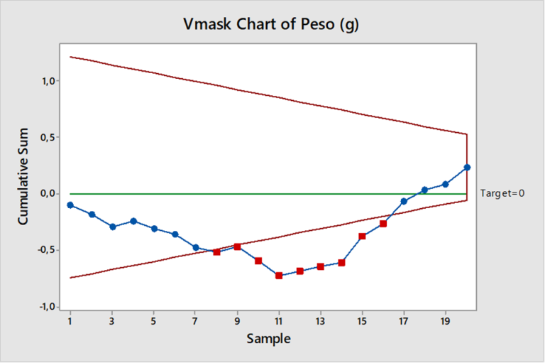 El tipo CUSUM de 2 lados, nos indica que entre el punto 8 y el 16 hay valores fuera de tendencia a investigar, son los que se encuentran fuera de la máscara.