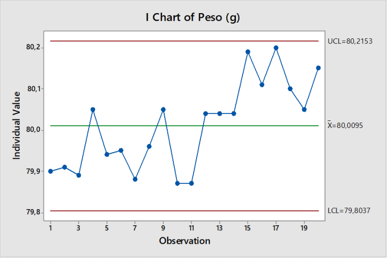 Ahora veamos La carta de control Individual generada a partir de los mismos datos. La misma no muestra puntos fuera de control: